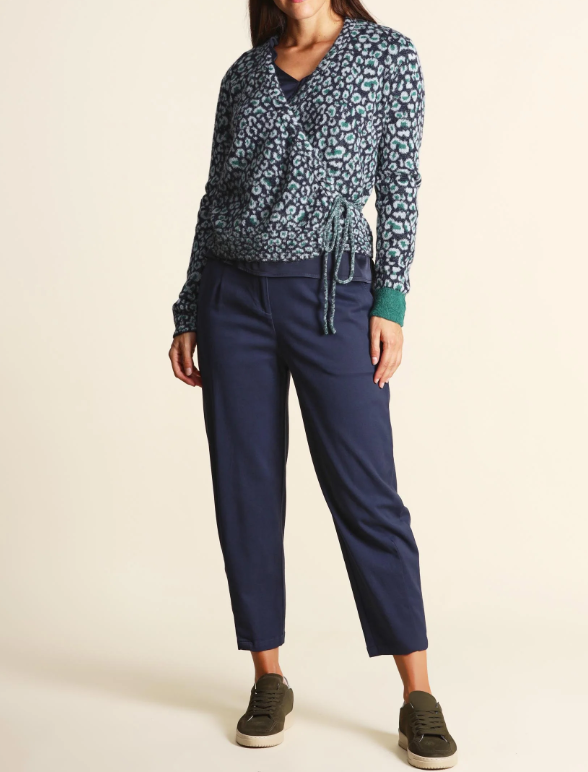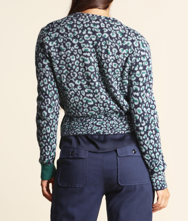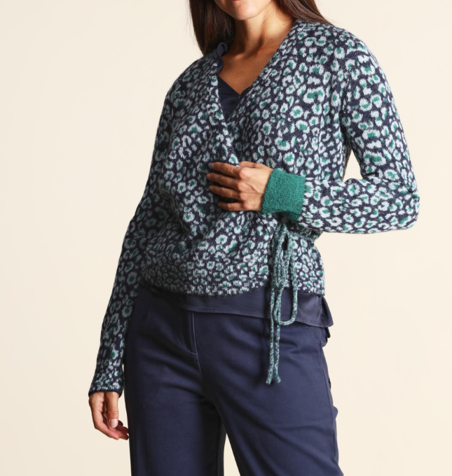 Cardigan jacquard blu e azzurro in misto alpaca, chiusura con incrocio, scollo a V, linea semi aderente, maniche lunghe.