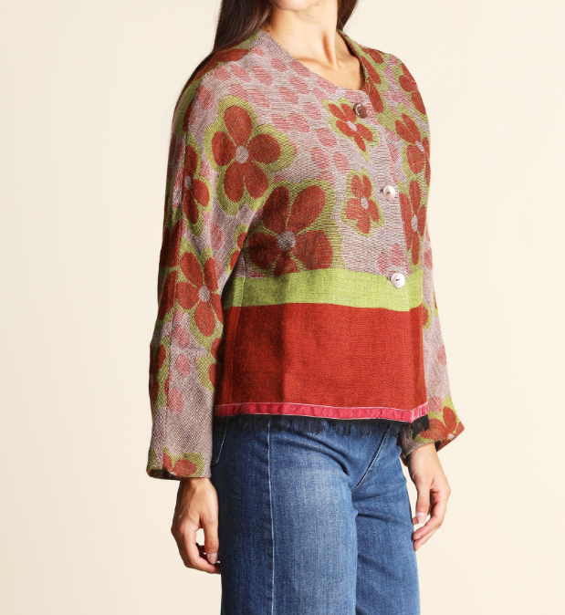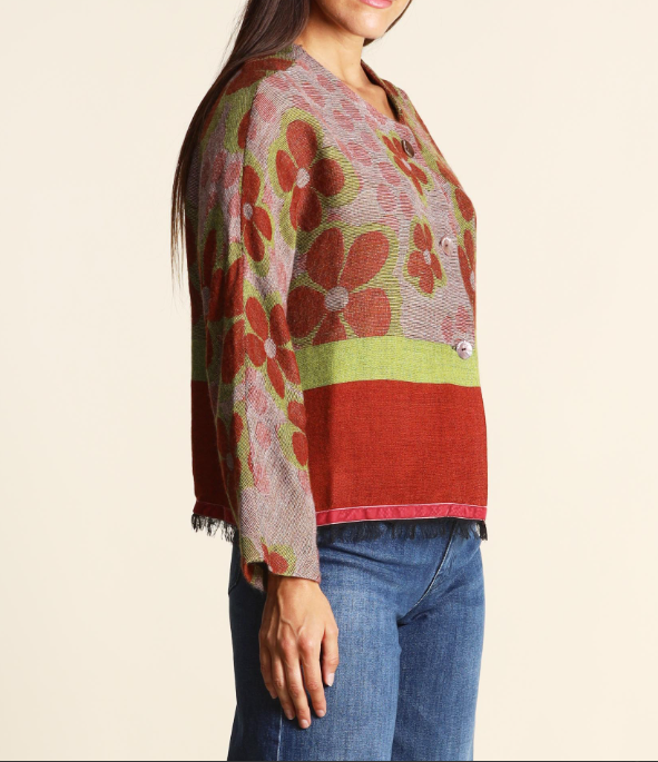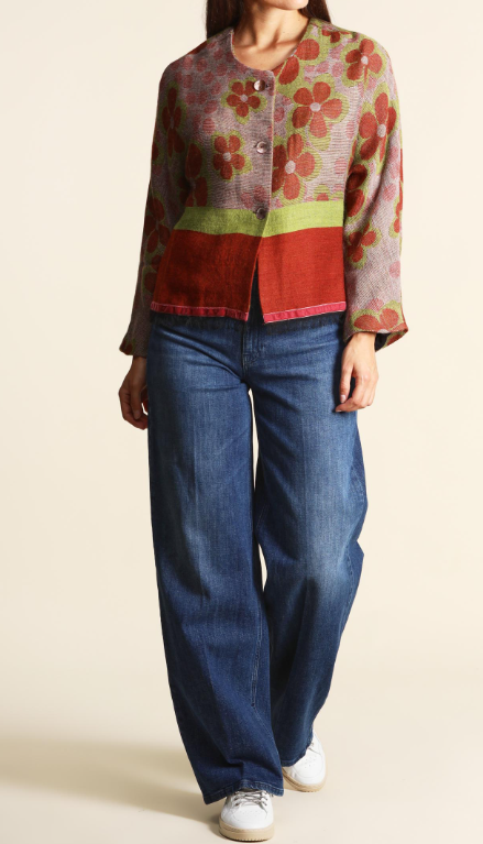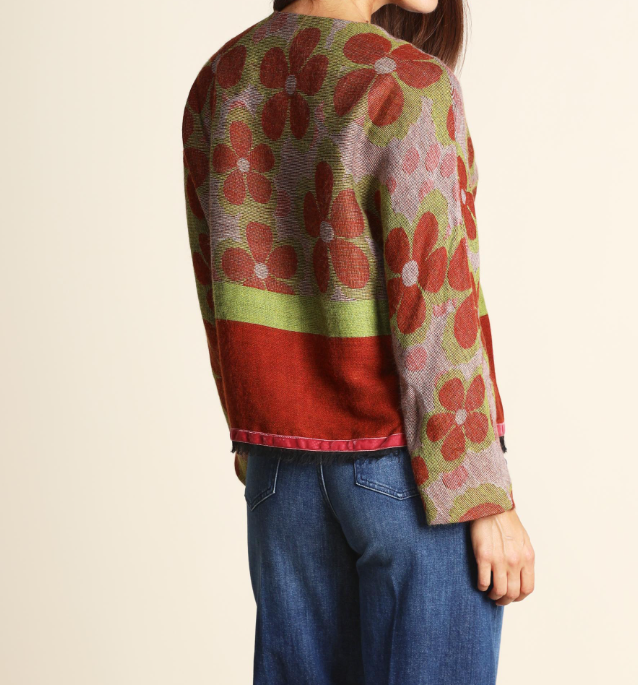 Giacca jacquard in maglia di misto modal, lana e alpaca, scollo tondo, linea morbida, chiusura con bottoni, maniche lunghe, foderata, dettaglio di profilo in velluto sul fondo.