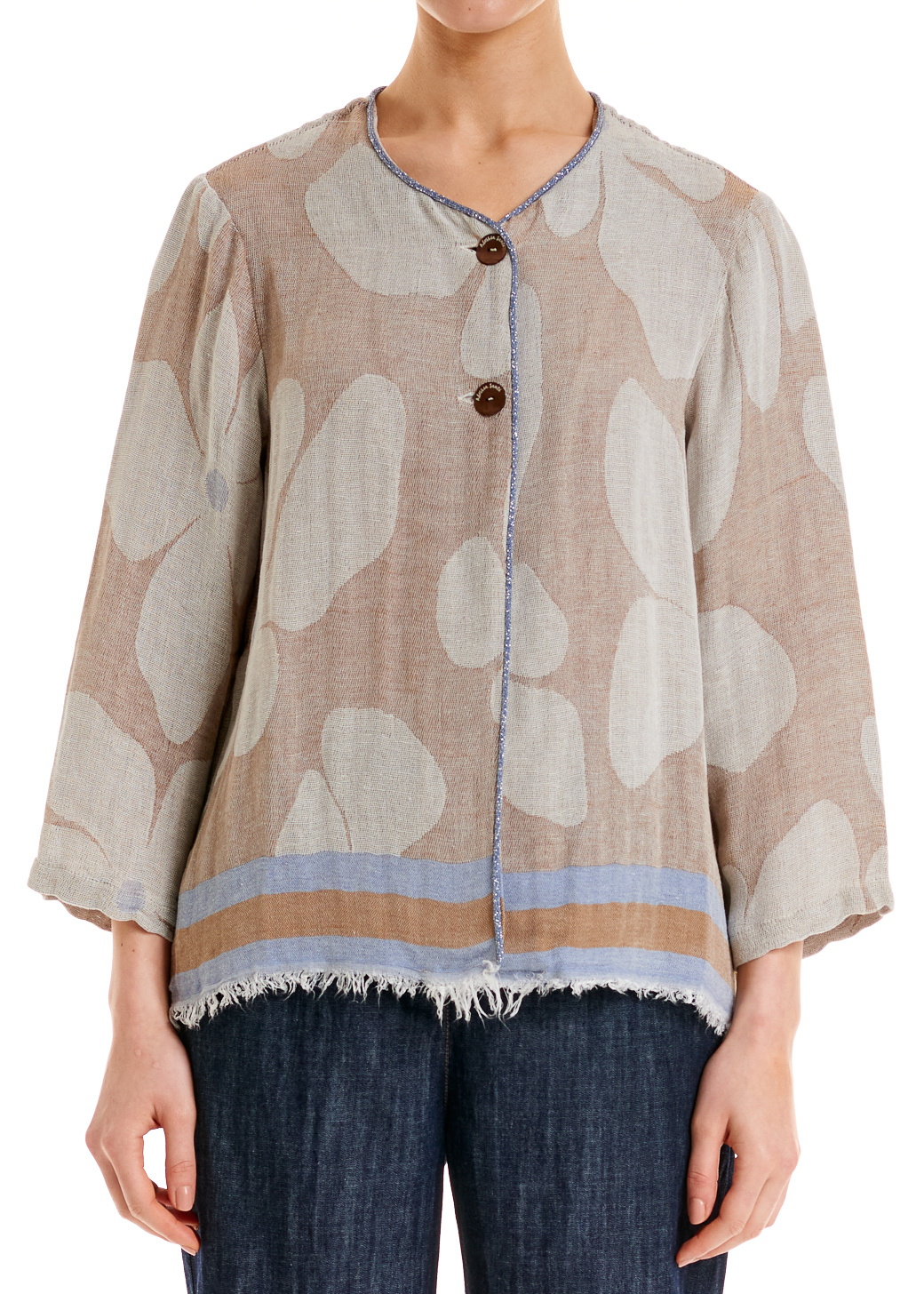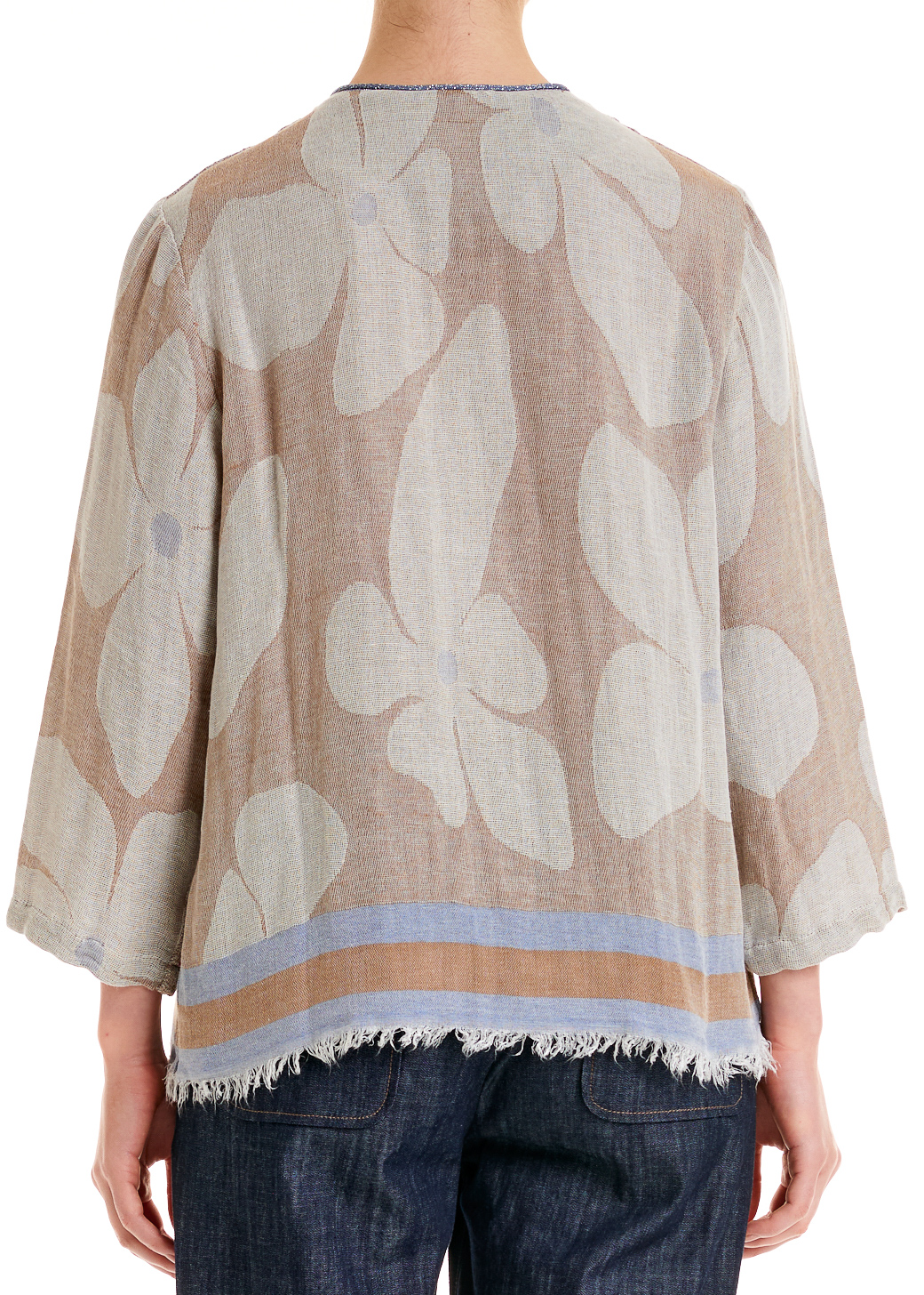 Un capo dal fascino boho-chic con collo a giro, maniche sette ottavi e fondo sfrangiato.
