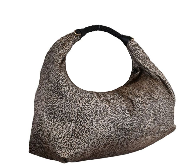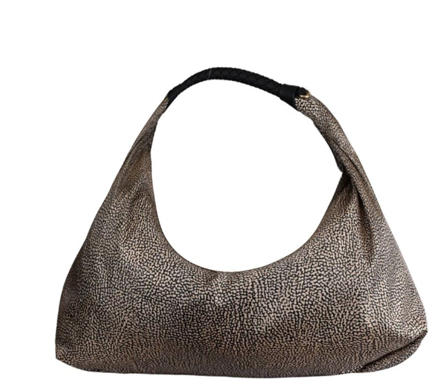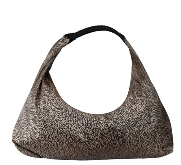 La borsa hobo di Borbonese ha una silhouette sinuosa e la scelta di materiali morbidi contribuisce a rendere questo accessorio un must have di stagione.