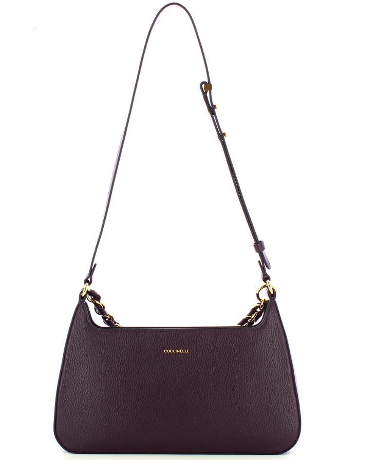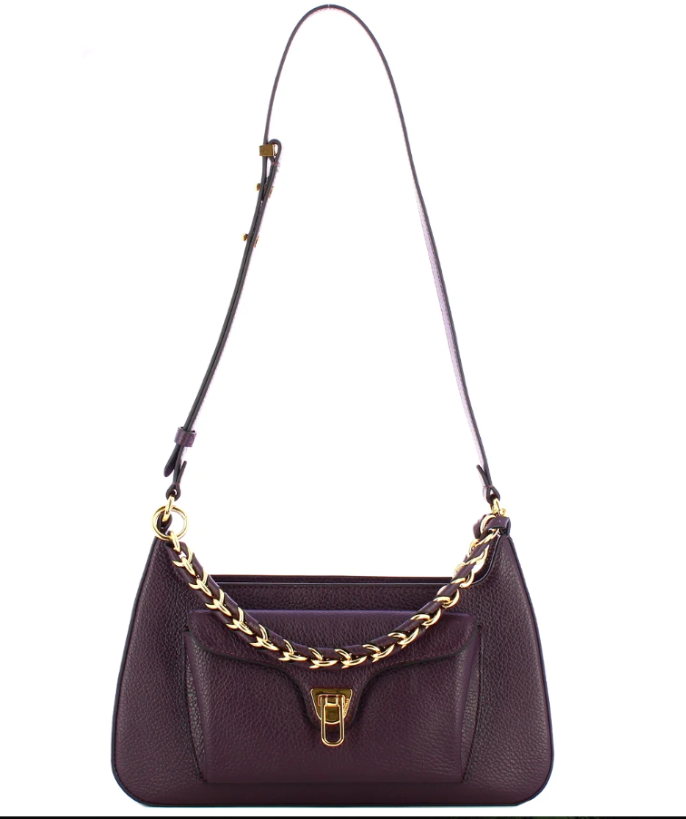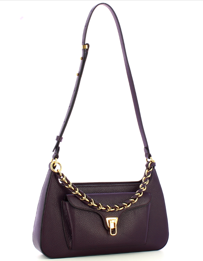 Borsa a tracolla Beat Generation Coccinelle, modello in pelle granata dalla linea sinuosa. Tasca frontale con iconica chiusura a battente e tracolla regolabile. Manico in pelle intrecciata fisso e chiusura principale con zip. Interno foderato completo di tasca.