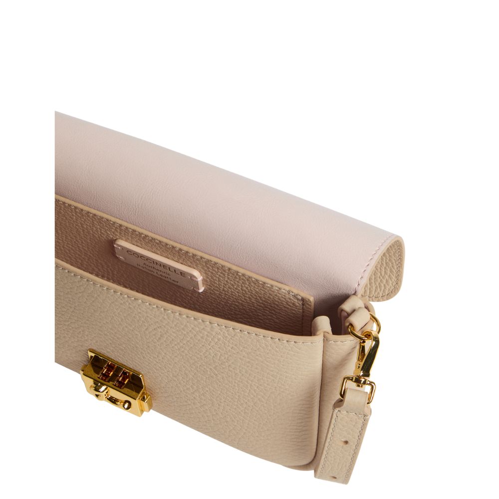 Questa borsa a tracolla appartiene alla linea Coccinelle C-Me Lock e rappresenta un?evoluzione raffinata del logo C-Me, reinterpretato in una chiusura moderna e distintiva che ne enfatizza l?essenza contemporanea. C-Me Lock si distingue per un design audace e funzionale, perfetto per adattarsi alla vita quotidiana con stile.