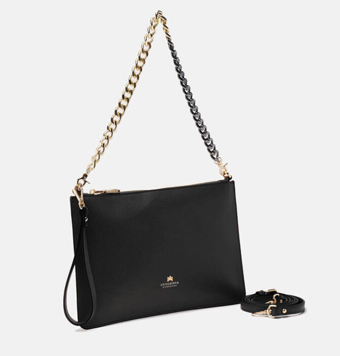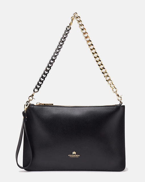 Una borsa dal design lineare ed elegante che permette di portare con sé il necessario nelle serate piene di impegni. Il pellame dà un tocco grintoso e alla moda; comodissima da indossare a spalla con la leziosa catena, può anche trasformarsi in pochette durante gli aperitivi con le amiche portandola a mano. Perfetta per la donna che non vuole passare inosservata.