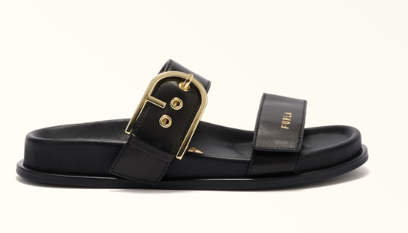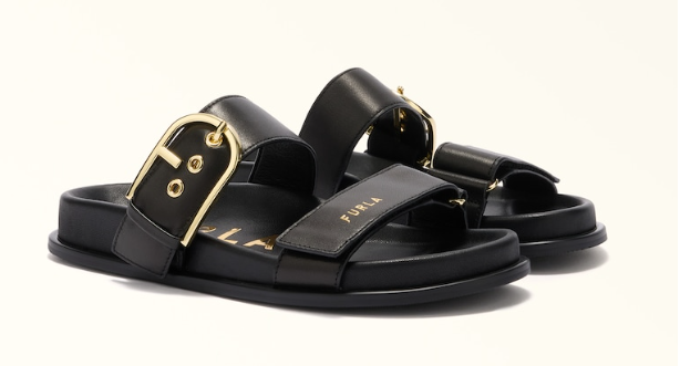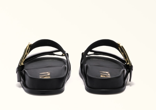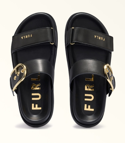 Furla Solea è un sandalo dall'allure sportivo e metropolitano, con doppia fascia regolabile in morbida pelle nappa e fibbie a forma di logo Arco. La soletta ergonomica si abbina al fondo in gomma dal profilo sagomato.