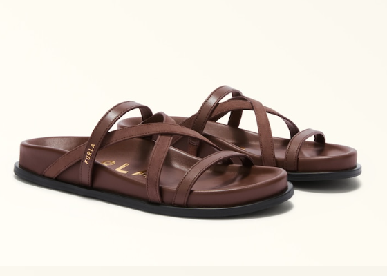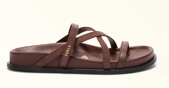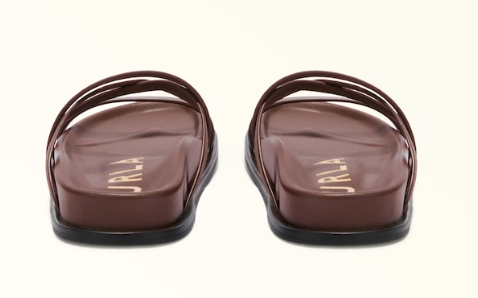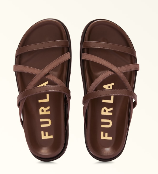 Furla Solea è un sandalo dall'allure sportivo e metropolitano, con doppia fascia regolabile in morbida nappa e fibbie a forma di logo Arco. La soletta ergonomica in pelle scamosciata si abbina al fondo in gomma dal profilo sagomato.