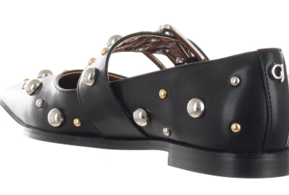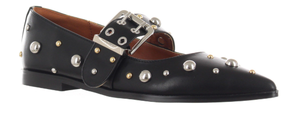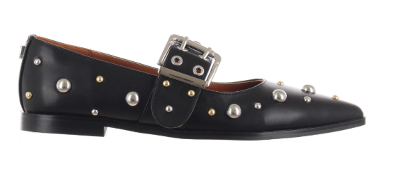 Ballerina in similpelle con borchie in metallo argento e oro. Chiusura con cinturino e fibbia con passante in metallo. Altezza tacco: 1,5 cm.