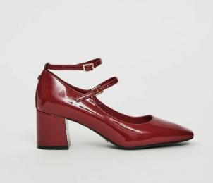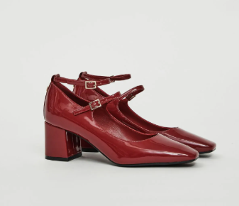 Mary Jane in morbida vernice sintetica con personalizzazione in metallo su cinturino posteriore. Il modello ha la punta quadra, la suola antiscivolo e il tacco ricoperto in materiale tomaia alto 5,5 cm.