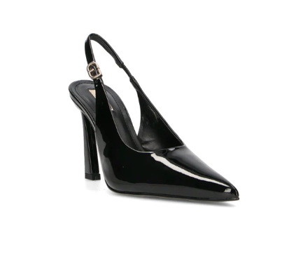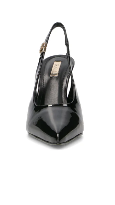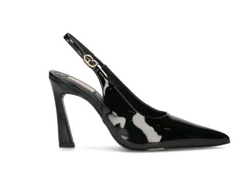 GAUDI' Slingback donna nera in vernice con tacco a stiletto di 10 cm e dettagli in metallo dorato con lettering GJ, è pensata per valorizzare con raffinatezza ogni look serale.