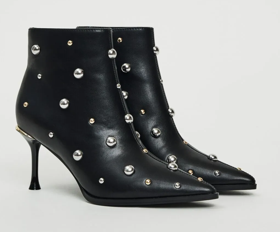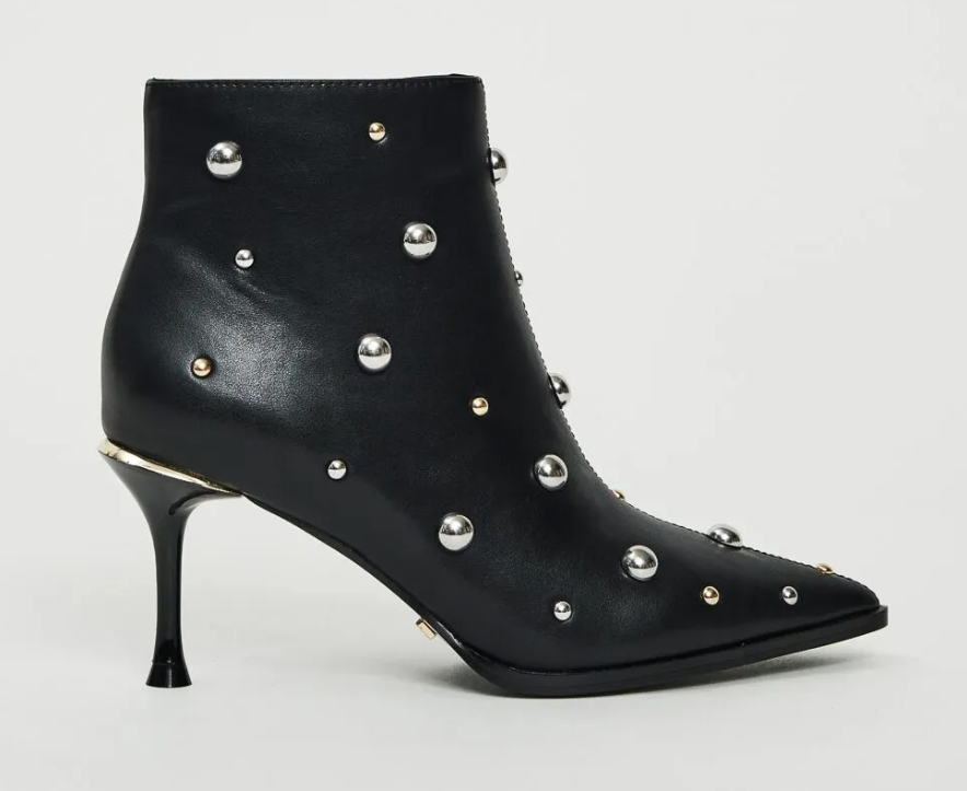 Scegli gli stivaletti in similpelle con borchie in metallo, zip e tacco stiletto. Perfette per un'eleganza grintosa e glamour. Altezza tacco: 8 cm