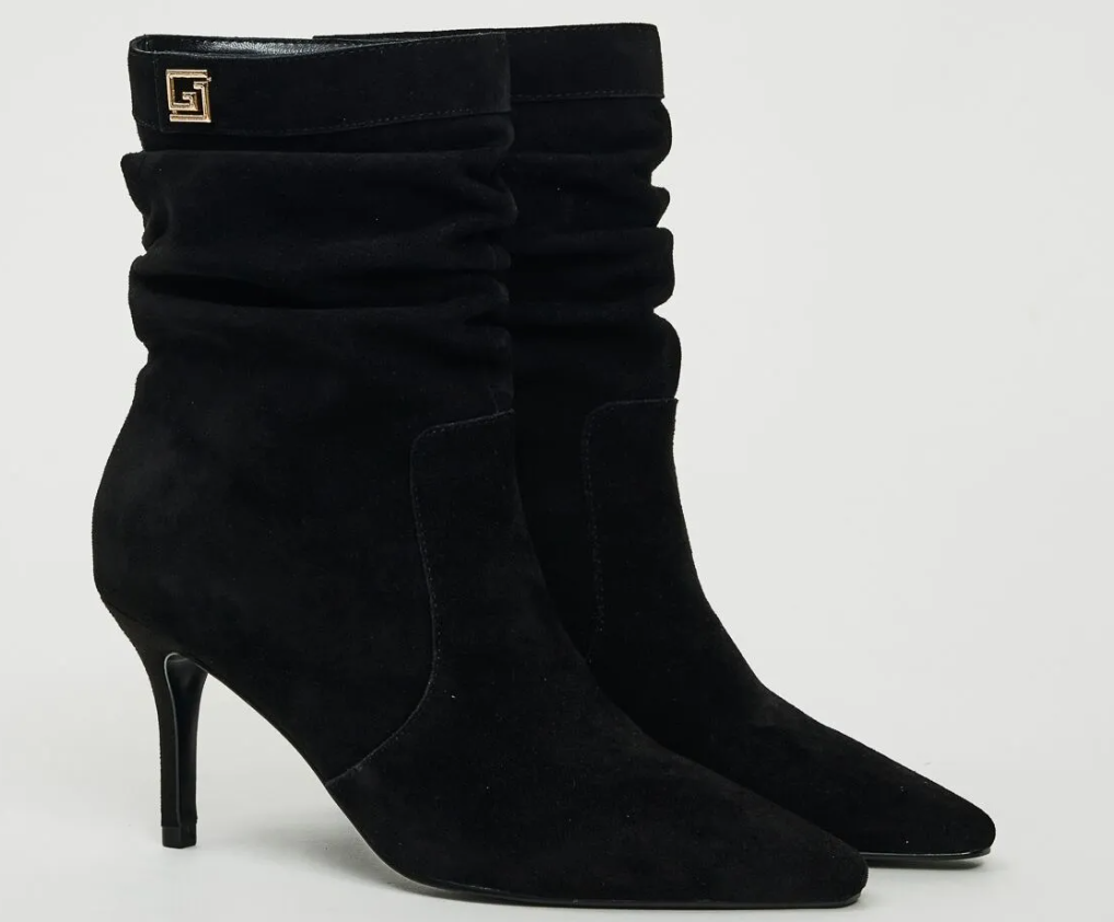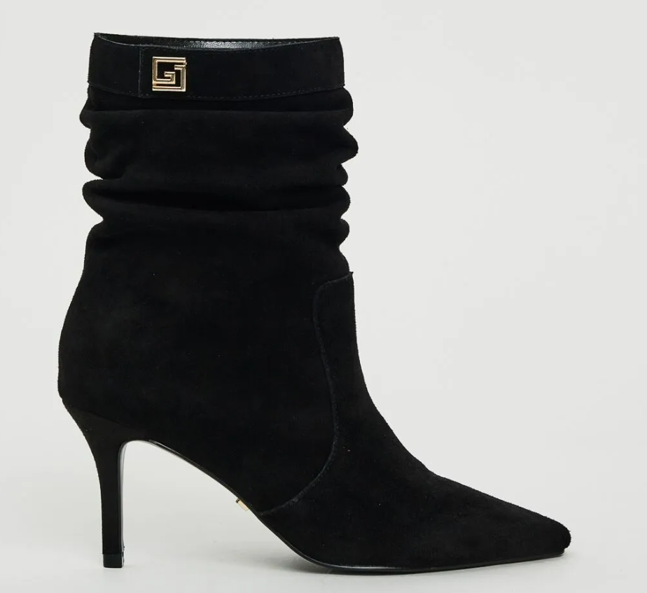 Scegli gli stivaletti in morbida similpelle scamosciata con pieghe e lettering GJ in metallo dorato. Per un look sofisticato e senza tempo. Altezza Tacco: 8 cm