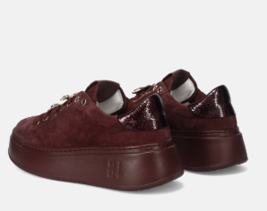 Dettagli: realizzata in pelle scamosciata idrorepellente color porpora con talloncino in pelle lucida stampa pitone