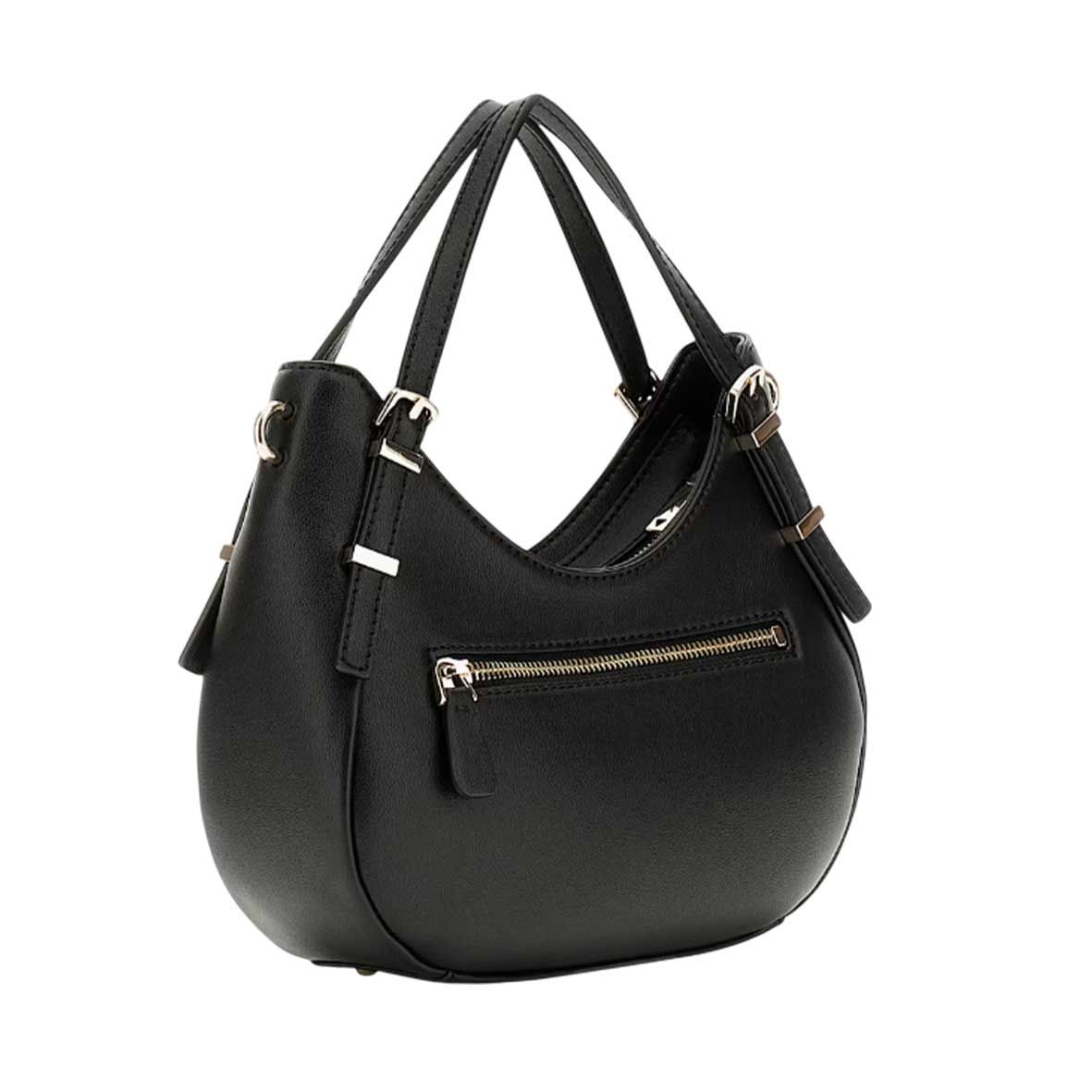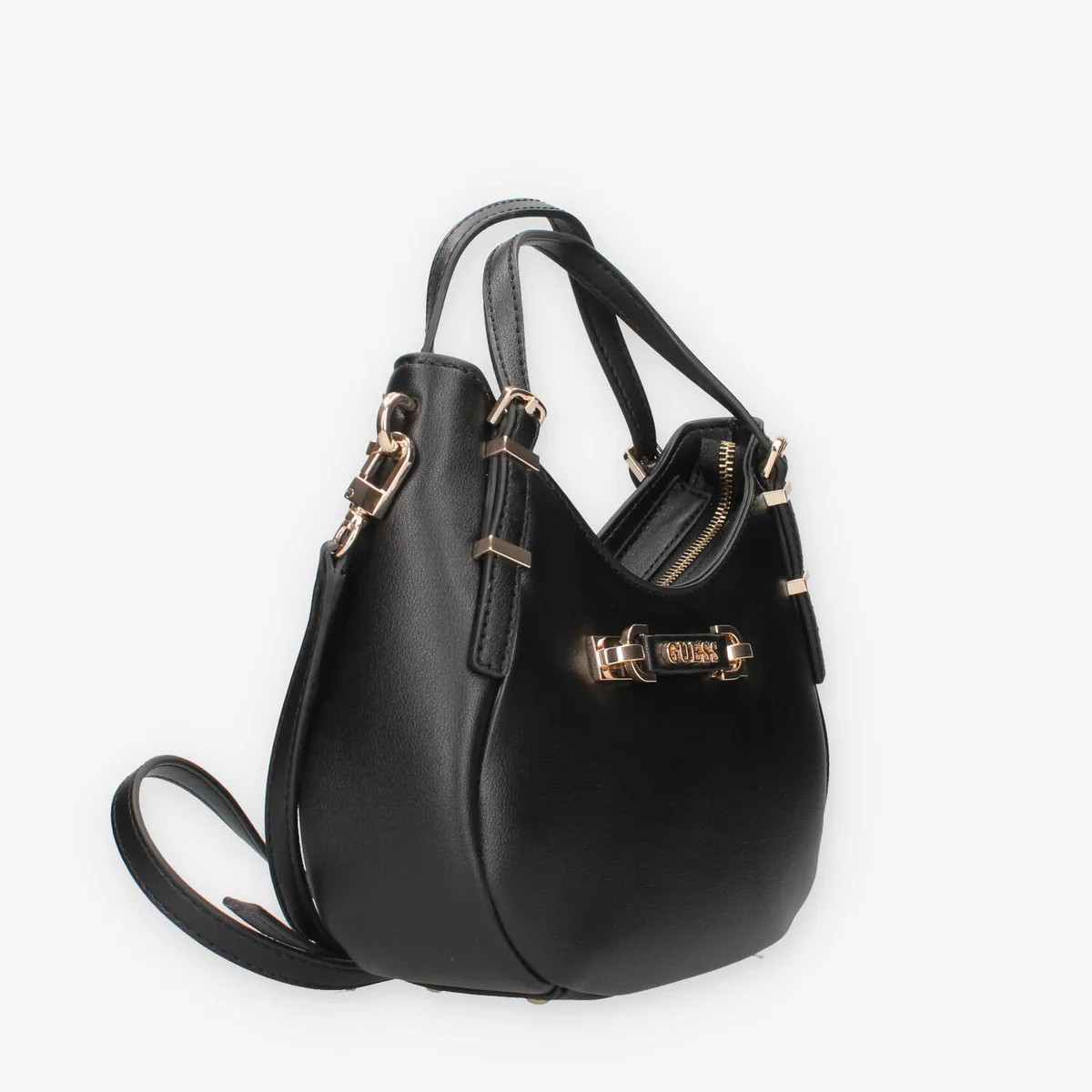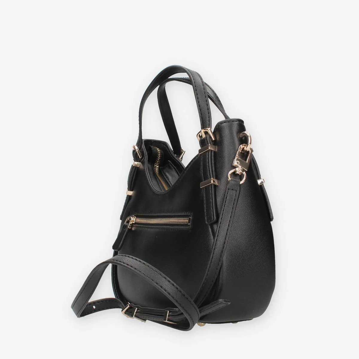 Borsa a tracolla nera in ecopelle dotata di 1 tasca interna e 1 esterna con zip, 3 fessure per carte di credito e tracollina opzionabile e regolabile.