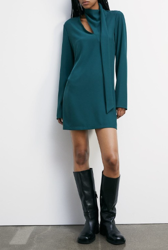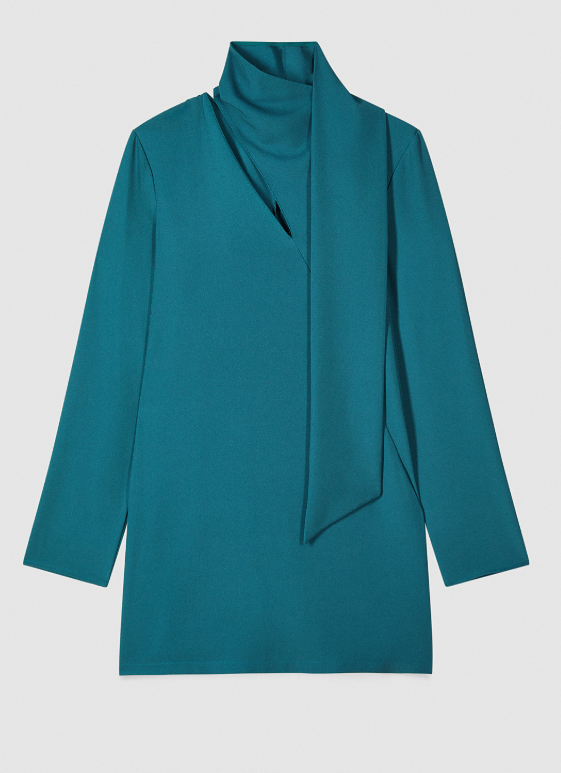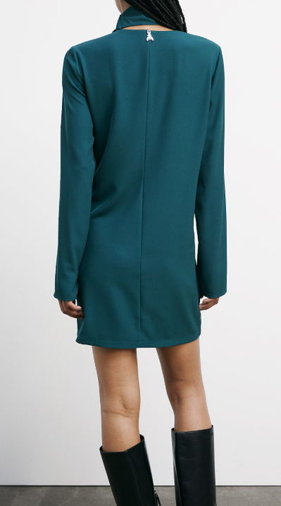 Abito PATRIZIA PEPE, caratterizzato da collo alto con taglio diagonale e parte lunga che si avvolge come una sciarpa intorno al collo, maniche lunghe, taglio ampio e dritto, lunghezza mini.