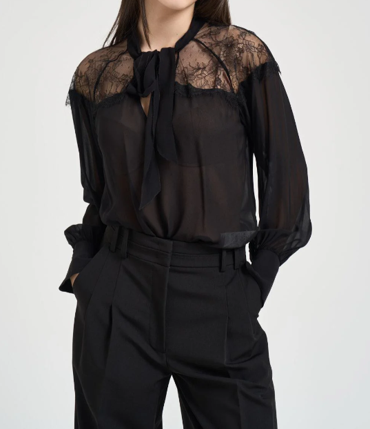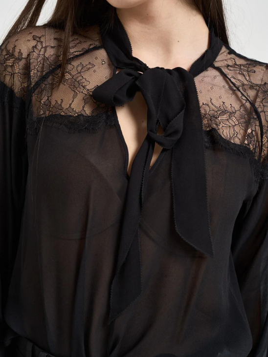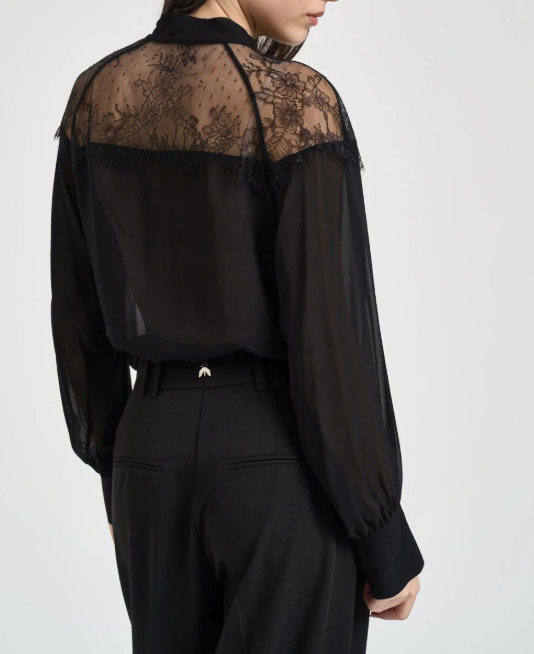 PATRIZIA PEPE Camicia donna con inserti in pizzo nero. Modello fluido. Inserti in pizzo sulle spalle. Fiocco su girocollo. Scollo a V. Manica lunga. Spalla scesa. Polsini con dettaglio logo metallizzato. Georgette di viscosa e pizzo. Composizione: 100% viscosa.