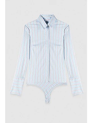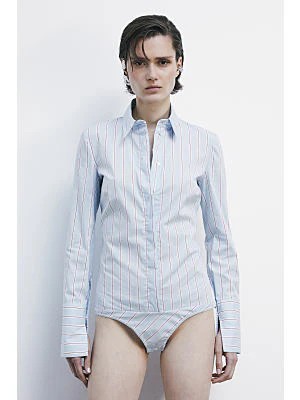 Parte della capsule Back To Office, questa camicia body a righe è realizzata in popeline di cotone stretch fresco e confortevole. Il design pulito con colletto classico e bottoni nascosti è valorizzato da polsini alti con Fly in metallo. Perfetta sotto giacca nei nostri completi, si abbina anche a longuette aderente o a denim per un look business glam o casual contemporaneo.
