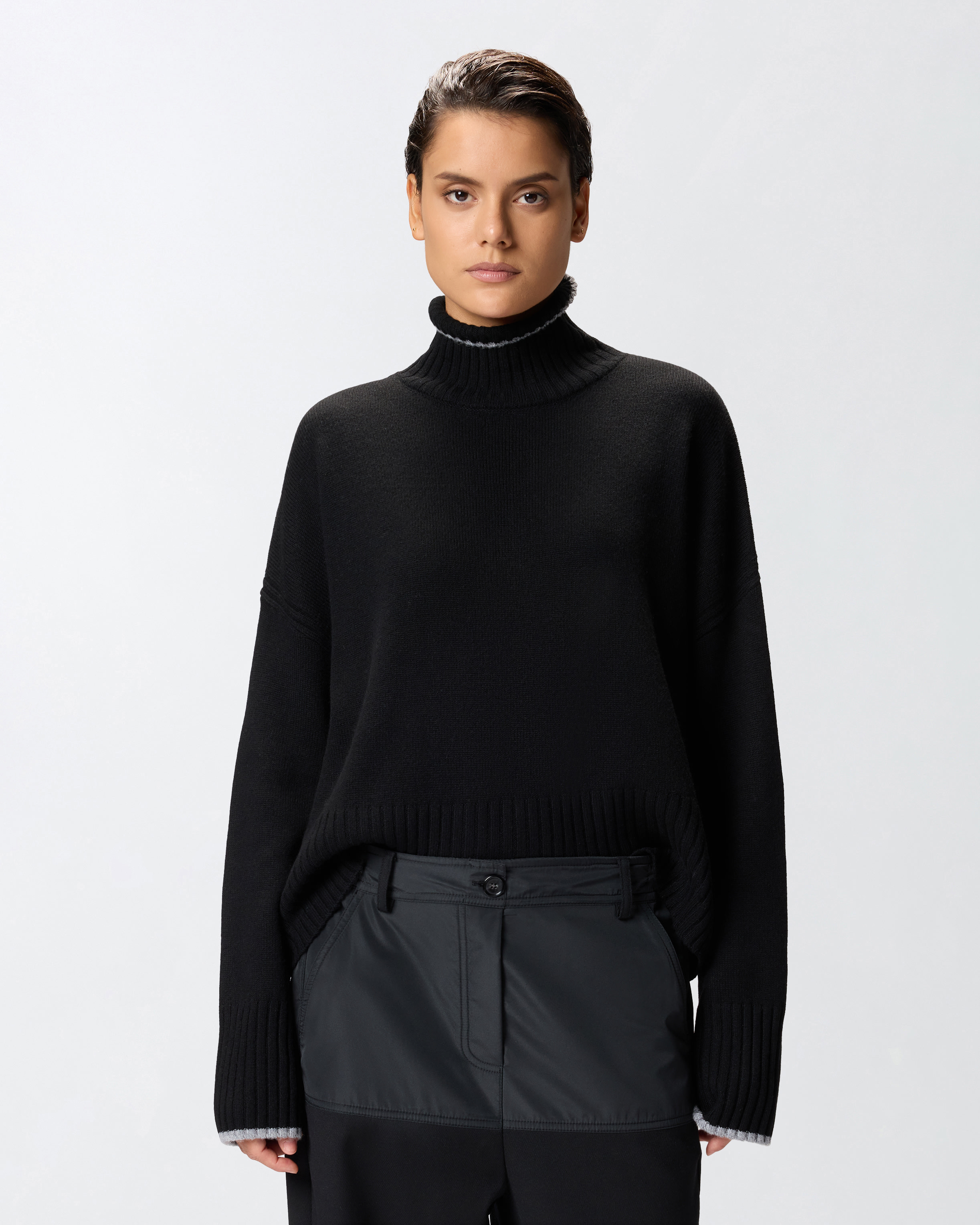 Dolcevita a maniche lunghe in misto lana merino e cashmere, ideale per scaldare i tuoi outfit della stagione fredda. Essenziale e contemporaneo, questo design diventerà il protagonista indiscusso di tutti i tuoi outfit, qualunque sia l'occasione. Il filato a contrasto su scollo e polsini dona un tocco di vivacità al design. Scollo, orlo e polsini sono lavorati a coste, mentre il tocco finale è dato dall'etichetta con logo lettering PINKO sul retro. Il capo è stato sottoposto a prove di finissaggio per ridurre al minimo la possibile formazione di pilling, garantendo una maggiore morbidezza e durabilità del tessuto.