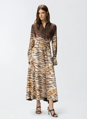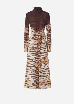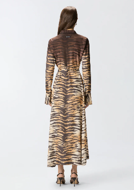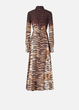 Abito chemisier lungo con gonna leggermente svasata, abbottonatura frontale, colletto a camicia, maniche con bottone sui polsi e sottile cintura in vita da annodare in base al proprio gusto. Realizzato in tessuto twill dalla mano fluida e lucente, particolarmente adatto anche per la stagione estiva, il modello si distingue per la seducente stampa animalier tigrata con parte superiore più scura dall'effetto sfumato, che viene piazzata a mano su ogni capo per trasformarlo in una creazione unica e inimitabile. Il vestito è completato dall'etichetta con logo lettering PINKO sul retro.