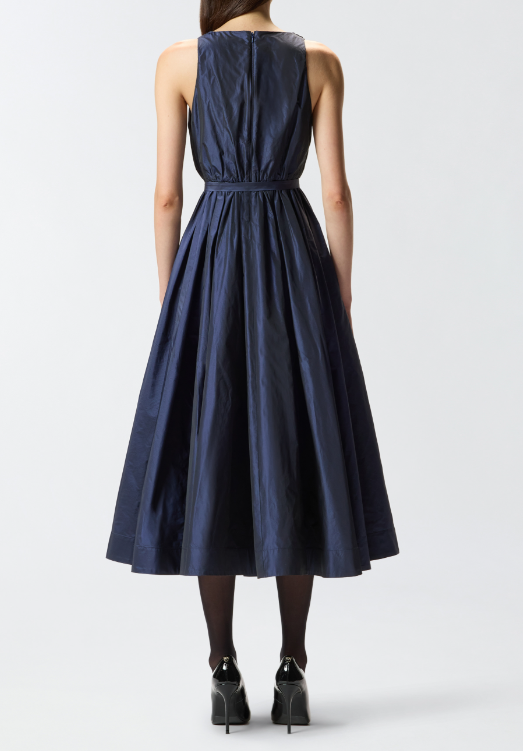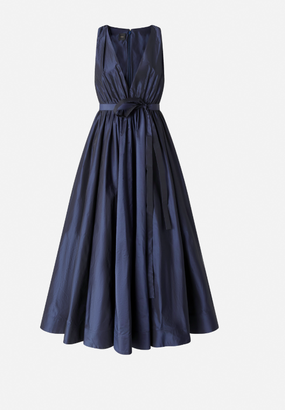 Abito lungo senza maniche con scollo a V e vita stretta con impunture e cintura abbinata, completato da un fiocco femminile sul davanti. Il tessuto leggero e lucido crea riflessi e si abbina perfettamente al volume morbido e dinamico che caratterizza il capo. Indossa questo stile da sogno e diventa la star di tutte le occasioni speciali.