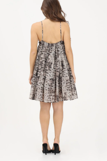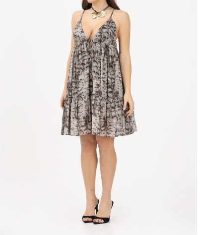 PINKO Abito corto beige contraddistinto da un accattivante disegno snake all over e realizzato in mussola di cotone con fodera interna, anch'essa in cotone, per assicurarti il massimo del comfort e della freschezza. Il capo presenta un design smanicato con sottili spalline regolabili, un profondo scollo a V e un inserto elasticizzato con bottoncino metallico frontale e piccole ruches sotto il seno da cui hanno origine morbide pieghe. Grazie alla silhouette vaporosa e femminile, messa ancora più in risalto dalla balza sul fondo, e alla fantasia grintosa e contemporanea, espressione del DNA PINKO, questo vestito è pronto a conquistare al primo colpo le fan dell'animalier e non solo.