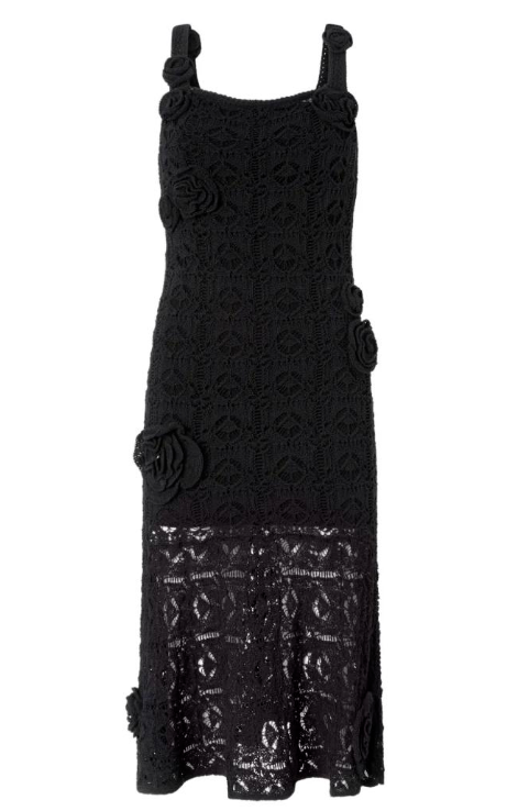 Abito PINKO, realizzato in filato misto cotone, interamente lavorato all'uncinetto. Presenta fiori applicati a mano di diverse dimensioni e posizionamento, sempre lavorati all'uncinetto, per un effetto finale tridimensionale e femminile, senza maniche, scollo quadrato, lunghezza midi.