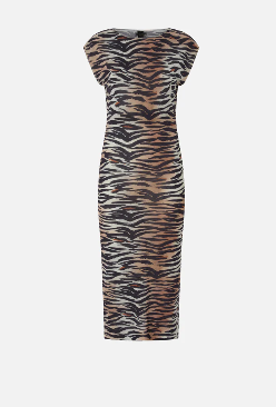 Abito midi in misto cotone con silhouette aderente a tubino, maniche ad aletta e collo tondo, contraddistinto da una seducente stampa animalier tigrata dall'effetto sfumato. Le linee femminili e la grinta del pattern incarnano un perfetto connubio di comfort e personalità e rendono questo vestito un capo irrinunciabile per chi ama distinguersi con audacia. Il modello è completato dall'etichetta con logo lettering PINKO sul retro.