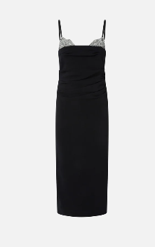 Abito midi senza maniche dalla silhouette aderente a tubino, dotato di sottili spalline regolabili e realizzato in tessuto doppio armaturato di misto viscosa stretch che avvolge la figura creando raffinati drappeggi sulla parte frontale. Il vestito è reso speciale dalle applicazioni in tulle sul davanti che fuoriescono a mo' di reggiseno, decorate da delicate rose sapientemente ricamate a mano con effetto tridimensionale e arricchite da cristalli di diverse forme e dimensioni che riflettono la luce con eleganza. La chiusura con zip invisibile sul retro e la fodera interna sono dettagli che completano questo capo, che diventerà il vero protagonista del tuo look.