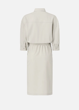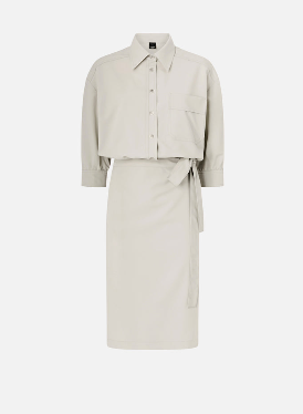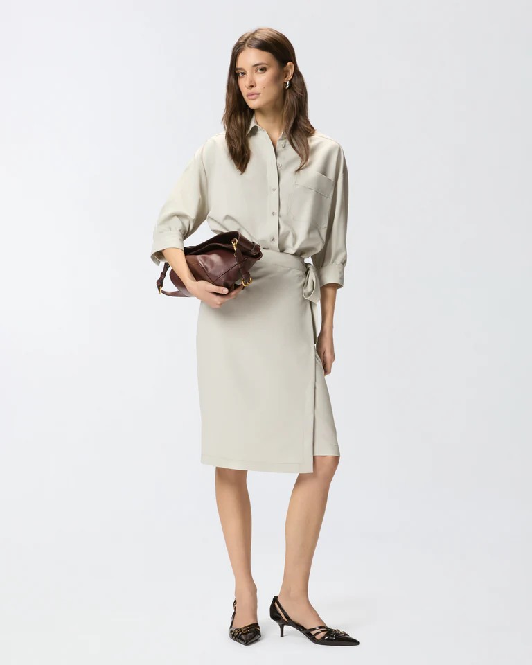 Abito midi realizzato in tessuto fluido di viscosa, ideale per accompagnare la figura senza costringere i movimenti. Il modello presenta una parte superiore più ampia e morbida, caratterizzata da un design a camicia con colletto classico, maniche a tre quarti con bottoni sul fondo, abbottonatura frontale e taschino applicato lato cuore, mentre la gonna, di stampo più elegante, si distingue per la linea aderente con chiusura a portafoglio da allacciare a fiocco su un fianco. Grazie alla sua versatilità, questo vestito si presta a essere indossato in diverse occasioni: ti basterà cambiare scarpe e accessori per adattarlo a eventi un po' più formali o a serate casual in compagnia.