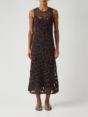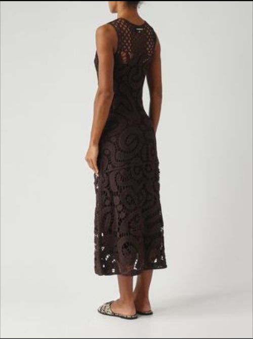 Interamente realizzato in crochet, questo abito si distingue per la sua eleganza femminile e una silhouette fluida e versatile adatta a molteplici occasioni. Si caratterizza per una linea midi che scende con naturalezza seguendo le forme del corpo, creando un effetto di portamento sofisticato ma mai eccessivo.