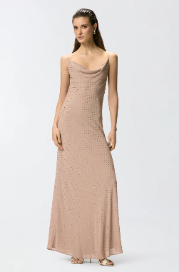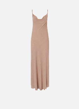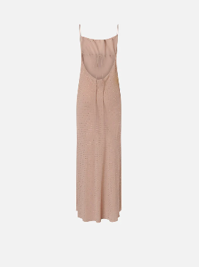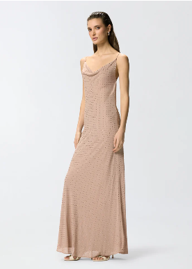 Abito lungo dalla silhouette a sottoveste con spalline sottili, morbido scollo frontale drappeggiato e ampio scollo tondo sul retro che lascia la schiena scoperta, attraversata solo da due nastrini da annodare al centro. Il modello è realizzato in un tessuto georgette dal raffinato aspetto opaco che accompagna il corpo con delicatezza e permette di ottenere una silhouette fluida e leggera, ed è impreziosito da brillanti strass disposti su tutta la superficie del capo.