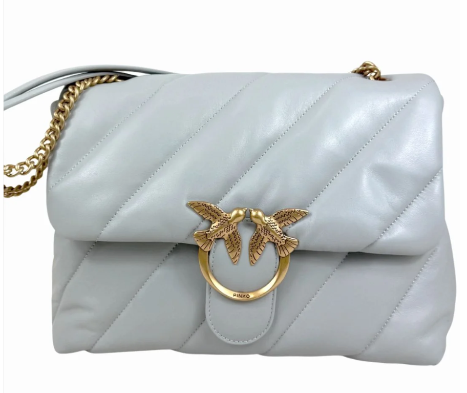 La borsa a tracolla Big Love Bag Puff in morbida nappa è caratterizzata da maxi trapuntatura obliqua, una tramezza con zip e una tasca a parete. Chiusura con fibbia in metallo taglio diamante Love Birds.