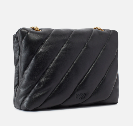 Big Love Bag Puff in morbida nappa con maxi trapuntatura obliqua. La chiusura è completata dall'iconica fibbia in metallo Love Birds Diamond Cut. L'interno è foderato in microfibra scamosciata e comprende tramezza chiusa con zip e tasca a parete. La tracolla combina la classica catena metallica rotonda al pratico spallaccio in nappa.