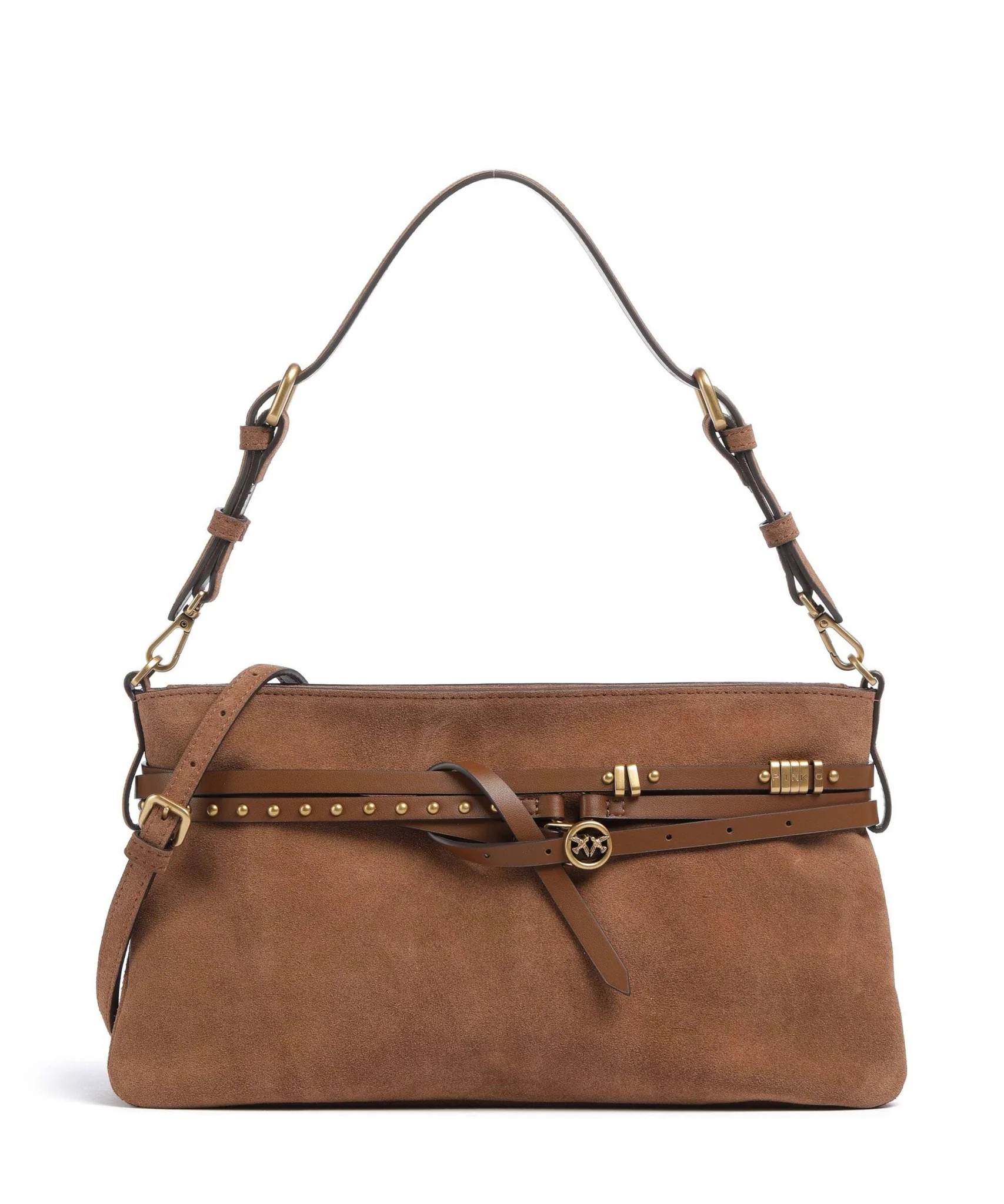 Borsa Belt Bag di medie dimensioni con design piatto e forma leggermente a trapezio, realizzata in morbida pelle scamosciata. Il modello è decorato da una sottile cintura coordinata regolabile che avvolge la parte superiore con più giri, arricchita da borchie arrotondate, una piccola fibbia circolare con gli iconici uccellini Love Birds e anelli decorativi in metallo che formano il logo lettering PINKO. Grazie alla tracolla in pelle scamosciata regolabile e rimovibile e al manico superiore regolabile nello stesso materiale, l'accessorio può essere indossato a spalla oppure crossbody, risultando estremamente versatile e pratico.