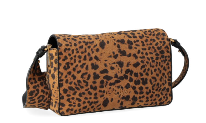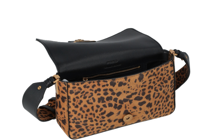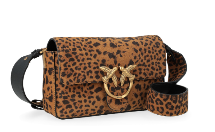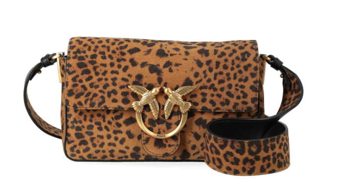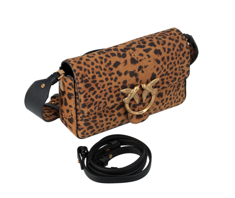 Borsa Pinko mini modello Love Bag One Slouchy realizzata in morbida pelle scamosciata con stampa leopardata. Presenta tracolla coordinata che permette di indossare la borsa a spalla, un tracolla in pelle nera e una chiusura a baccello con bottone magnetico. Caratterizzata da fibbia con logo Love Birds Diamond Cut metallico in galvanica antique gold e tasca interna a parete chiusa con zip.