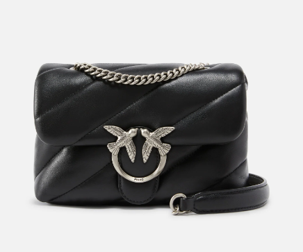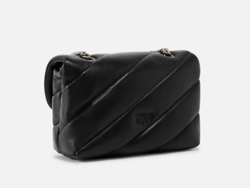 Mini Love Bag Puff in morbida nappa con maxi trapuntatura obliqua. La chiusura è completata dall'iconica fibbia in metallo Love Birds Diamond Cut. L'interno è foderato in microfibra scamosciata e comprende tramezza chiusa con zip e tasca a parete. La tracolla combina la classica catena metallica rotonda al pratico spallaccio in nappa.