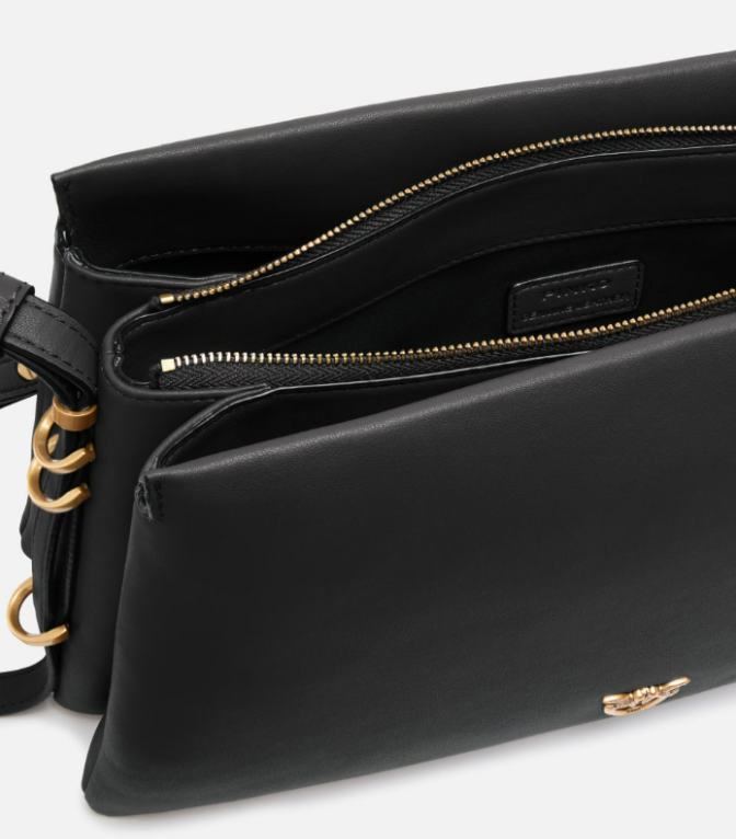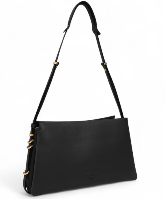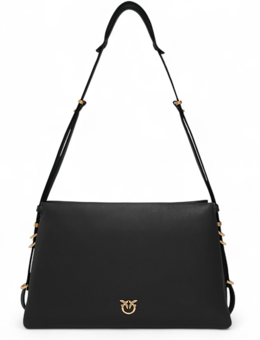 PINKO One, Two, Three Bag è una borsa a tracolla in pelle mano seta dalla forma a trapezio, con texture liscia e raffinata. La struttura morbida offre tre scomparti, di cui uno con chiusura zip, foderati in cotone per massima praticità. Completa di tracolla regolabile con dettagli in metallo e logo Love Birds Diamond Cut, unisce design minimal e materiali di pregio, perfetta per look casual o eleganti. Dimensioni: 33x19x6 cm.