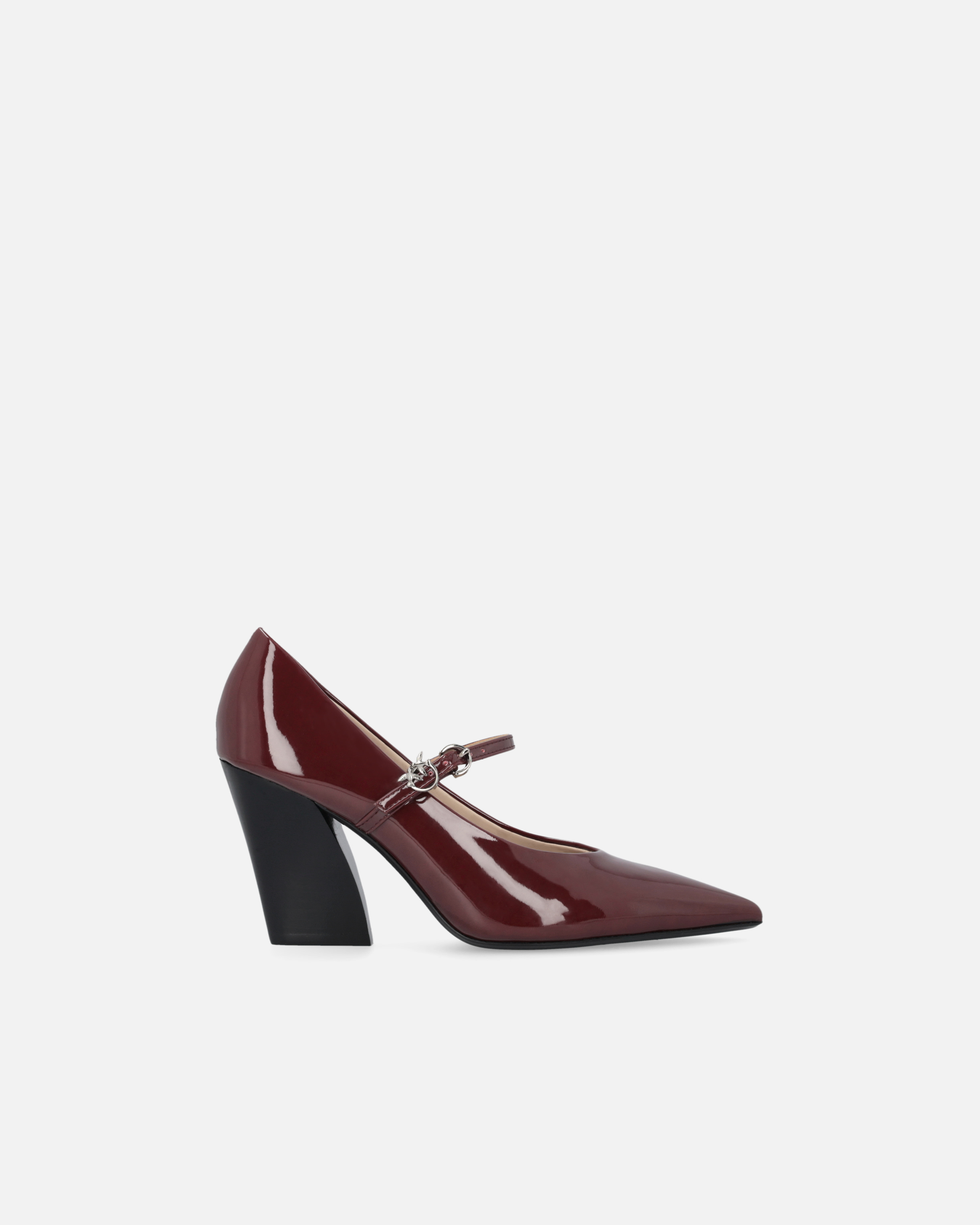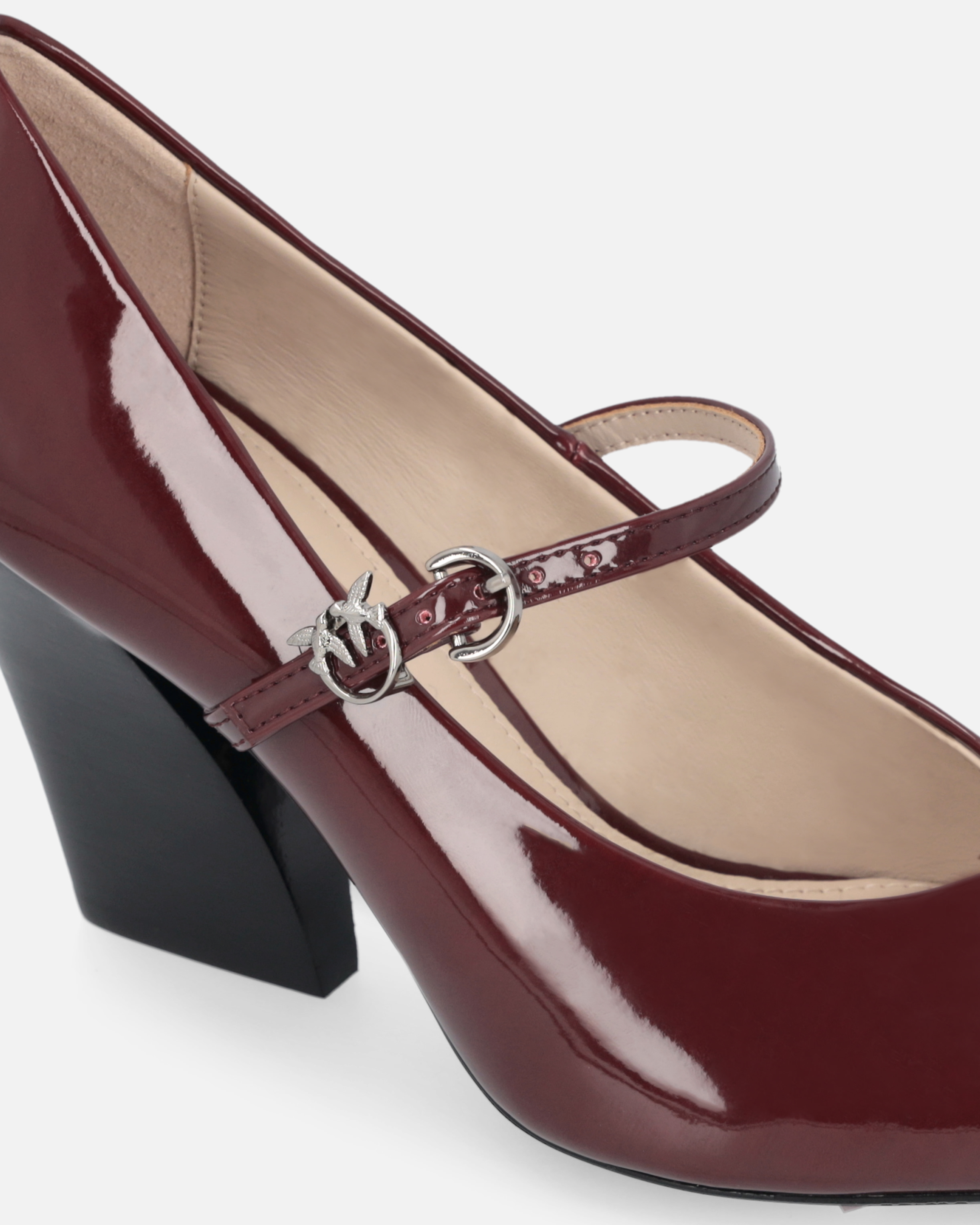 Mary Jane a punta con effetto pelle verniciata e tacco a blocco alto 8 cm. Le scarpe vengono chiuse da un elegantissimo cinturino sottile con fibbia e accompagnato dall'iconico logo Love Birds coordinato. Il design asimmetrico conferisce alla scarpa un aspetto elegante e contemporaneo, ideale per chi cerca un perfetto equilibrio tra stile unico e comfort. Abbina il modello a una gonna sofisticata per un look indimenticabile, da indossare dalla mattina alla sera.
