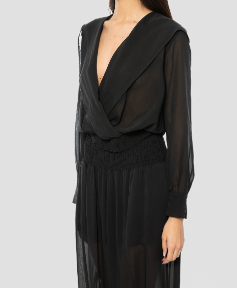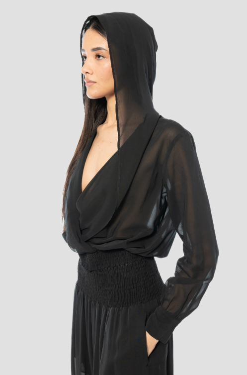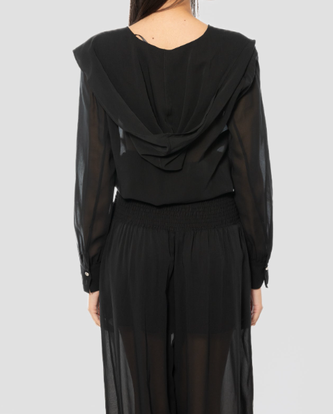 Camicetta PINKO realizzata in viscosa trasparente con cotone. Presenta una profonda scollatura a V, un drappeggio con cappuccio sul retro, maniche lunghe con polsini elasticizzati, orlo elasticizzato e vestibilità ampia.