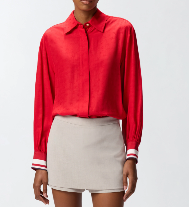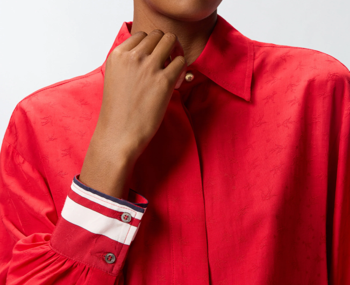 Camicia dal taglio classico con carré posteriore e particolare pannello arricciato, sempre sul retro. Il capo è realizzato in viscosa jacquard e la texture è personalizzata con un motivo con logo Love Birds. I polsi sono arricchiti da una stampa piazzata con righe d'ispirazione marinara. Perfetto con un pantalone dal taglio classico o in abbinamento al bermuda coordinato per un total look che non passa inosservato.
