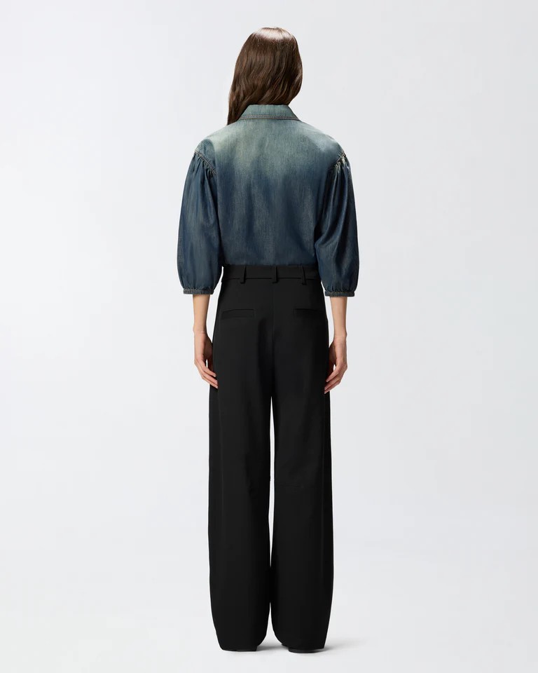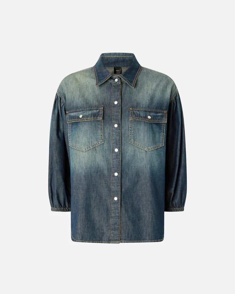 Camicia dalla linea dritta caratterizzata da colletto classico e da maniche a palloncino con lunghezza a tre quarti, spalla scesa e fondo elasticizzato. Il modello ripropone la classica camicia jeans in versione PINKO, e si presenta in un denim di puro cotone dalla mano fluida e leggera, caratterizzato da scoloriture e contrasti di colore che donano movimento e carattere al tessuto. A completare il capo con una nota funzionale troviamo le tasche con patta e bottone applicate sul petto, e la chiusura frontale, che riprende gli stessi bottoni dei taschini.