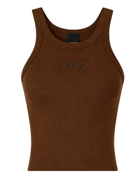 Il design presenta spalline larghe e uno scollo rotondo, che conferiscono alla canotta linee pulite e versatili. Il logo PINKO ricamato sul petto aggiunge un dettaglio distintivo e raffinato, rendendo il capo riconoscibile ma discreto.