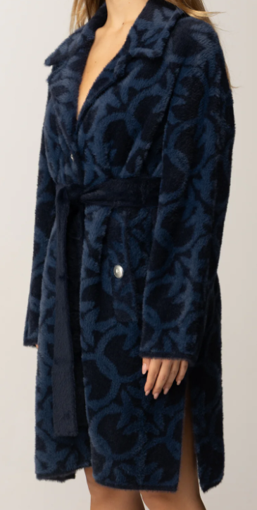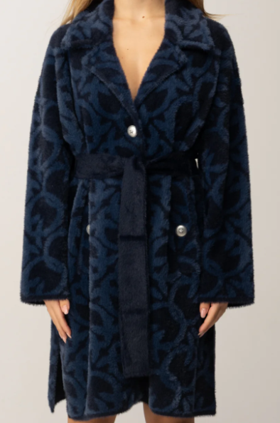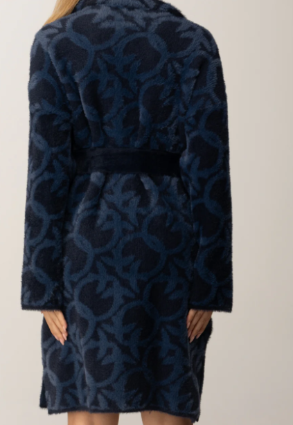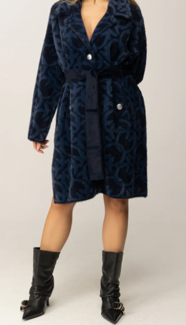 l cappotto Pinko conquista per il suo fascino sofisticato e contemporaneo. Realizzato in tessuto jacquard effetto velluto, presenta una fantasia logo all-over che gioca con luci e profondità, creando un effetto texture di grande impatto. La texture morbida e compatta dona calore e comfort, mantenendo una linea fluida e regolare che avvolge elegantemente la figura.