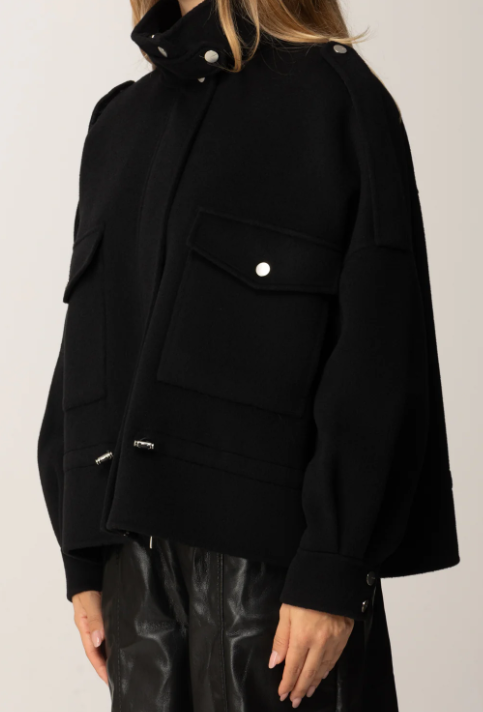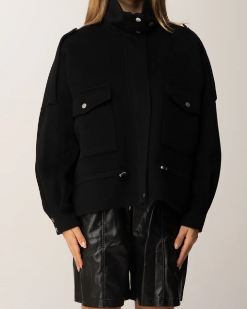 Il mix di materiali rende questa giacca avvolgente e resistente: la componente in lana assicura calore, mentre poliestere e nylon garantiscono comfort e durabilità. Una scelta versatile che puoi indossare sia con look casual, sia in abbinamenti più raffinati, giocando con contrasti e layering. I bottoni decorativi sulle spalle completano lo stile con una nota military-chic, raffinata ma contemporanea.