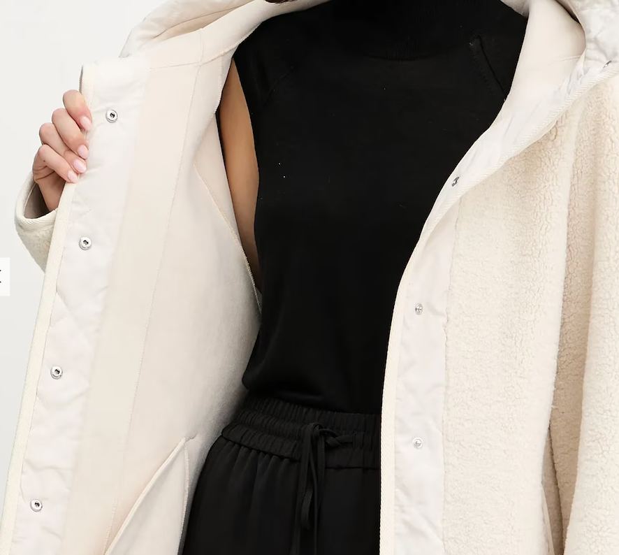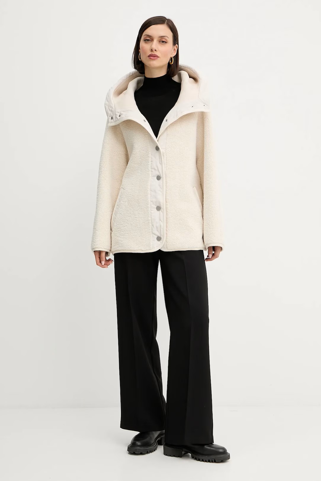 - Il colletto più alto e il cappuccio non staccabile offrono protezione aggiuntiva dal freddo.