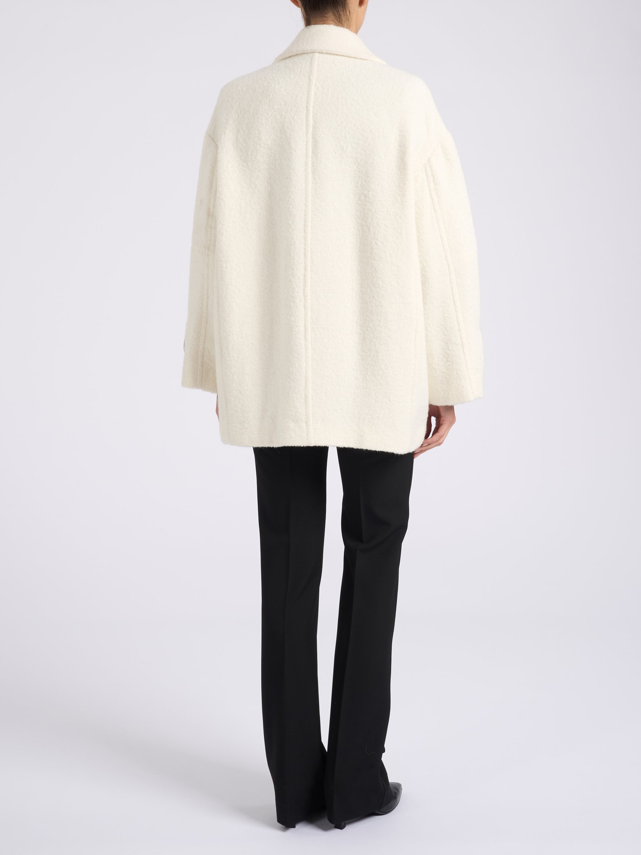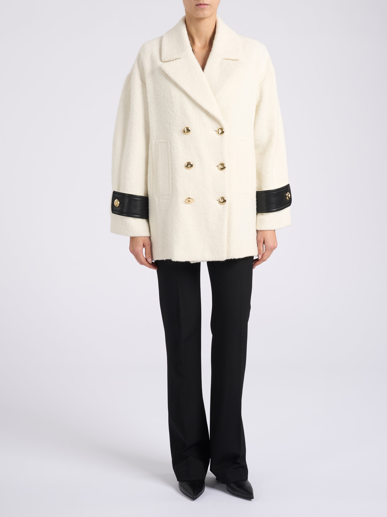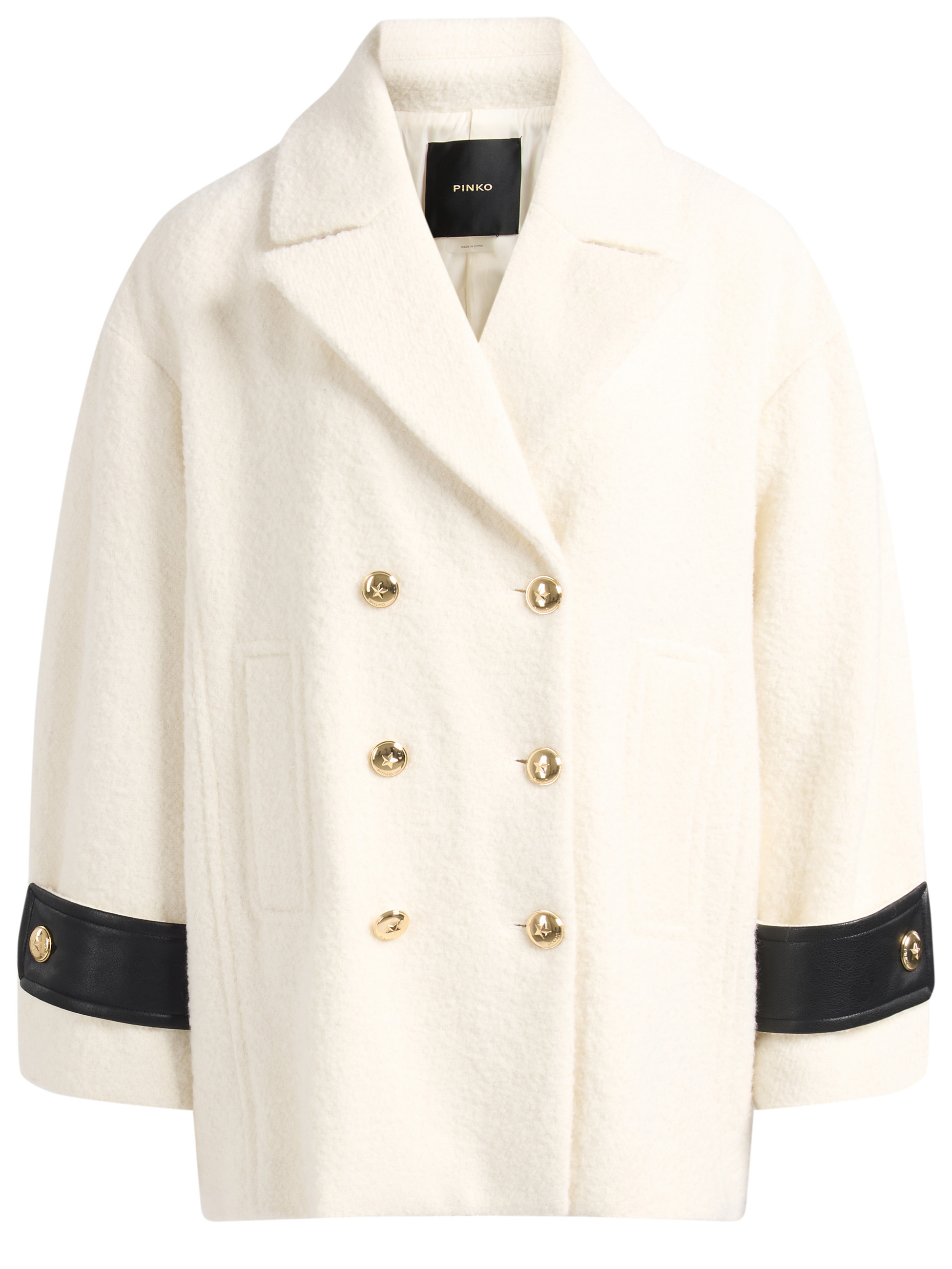 Cappotto Pinko Canederli realizzato in tessuto diagonale bouclé di misto lana color avorio. Presenta alamari ai polsi in tessuto spalmato, collo a revers e tasche verticali a filetto sul davanti e da chiusura doppiopetto con bottoni in metallo decorati da stella.