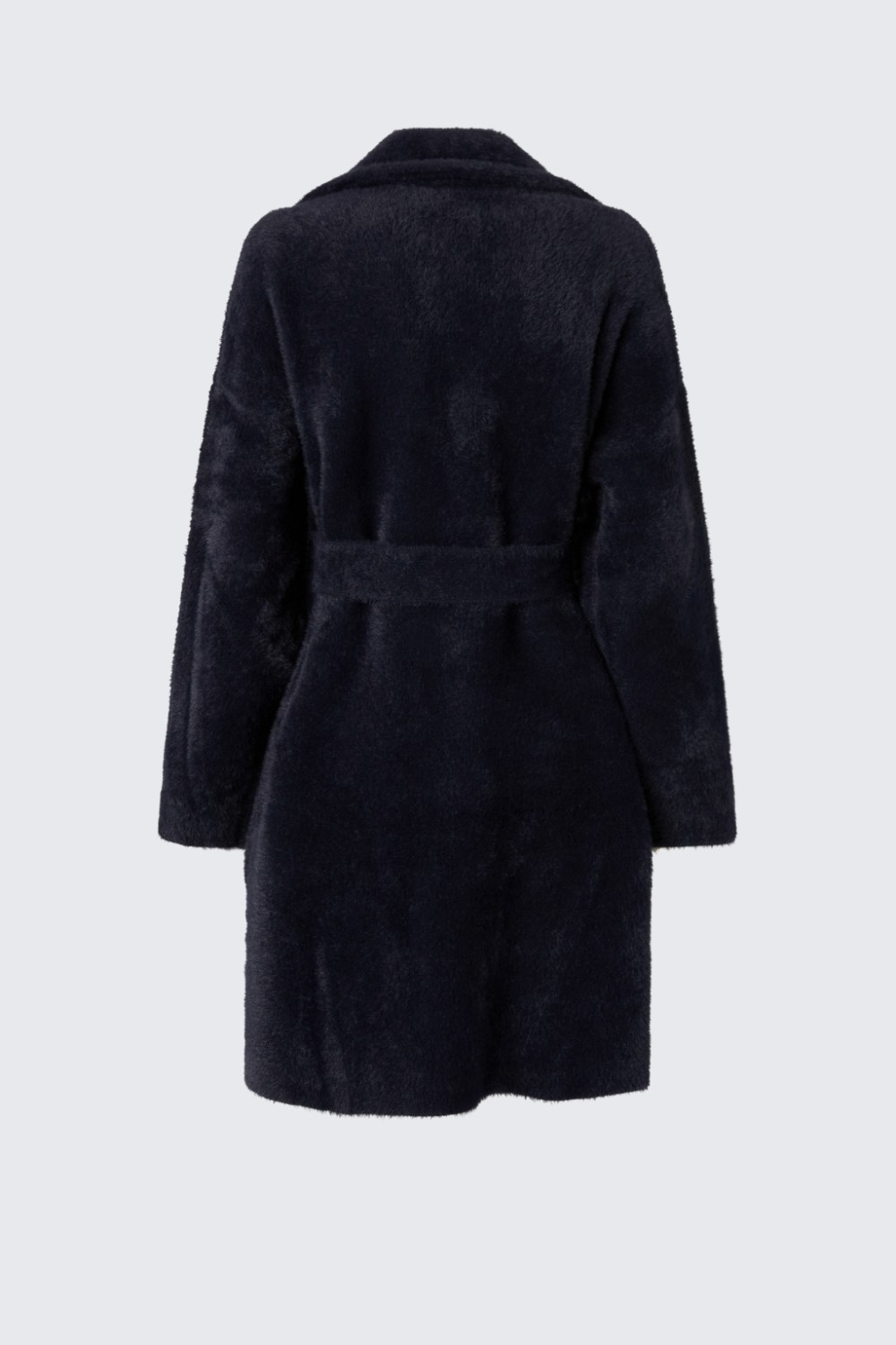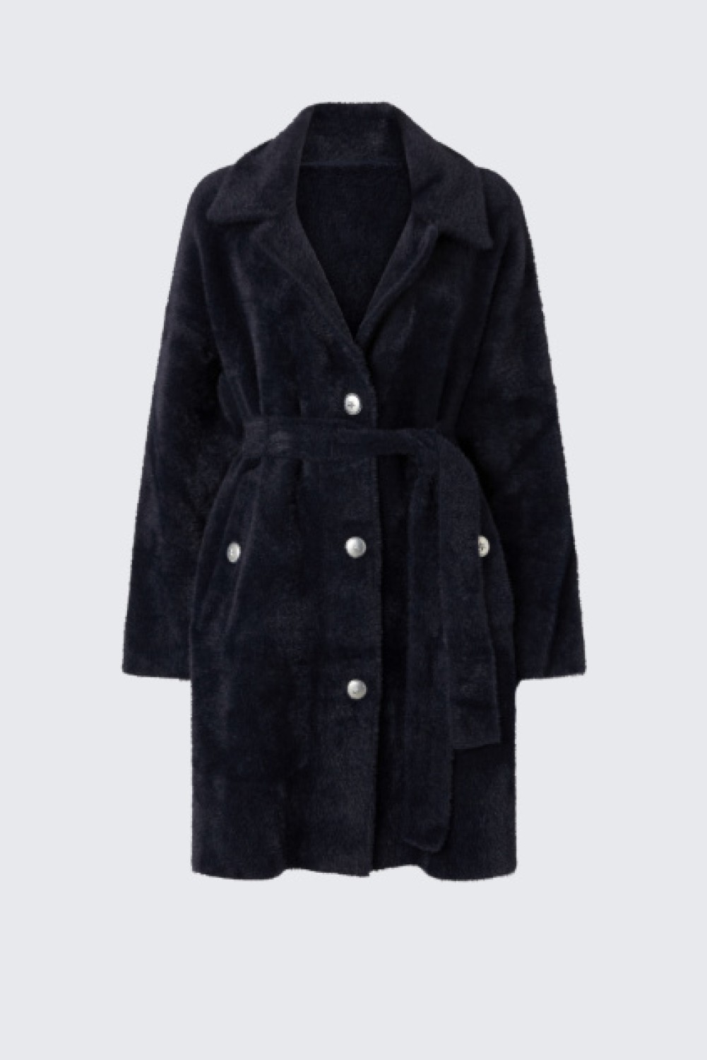 Cappotto PINKO realizzato in tessuto pregiato effetto "Faux Fur". Il cappotto ha una vestibilità morbida, una cintura realizzata in questo tessuto che si annoda in vita, un revers morbido, maniche lunghe, chiusura a un giro con bottoni metallici decorati con stelle, lunghezza midi.