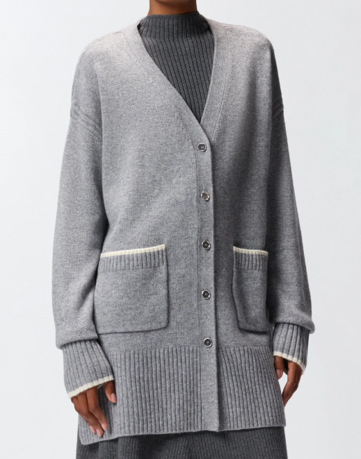 Cardigan lungo con scollo a V e spalle scese, realizzato in soffice misto lana merino e cashmere, il tessuto ideale per le giornate all'insegna del relax. Il filato a contrasto mette in risalto le tasche e gli orli delle maniche in modo discreto e raffinato. Il capo è stato sottoposto a prove di finissaggio per ridurre al minimo la possibile formazione di pilling, garantendo una maggiore morbidezza e durabilità del tessuto. Orlo e polsini sono lavorati a coste, mentre il tocco finale è dato dall'etichetta tono su tono con logo lettering PINKO dietro al collo.