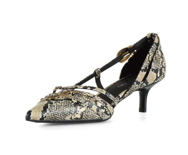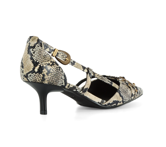 Décolleté in pelle con tacco basso caratterizzate da un'audace stampa pitone all over. Il design affusolato con punta sfilata è valorizzato da cinturini sottili che si incrociano delicatamente sul collo del piede, assicurando sostegno e un tocco di sensualità. La fibbia gioiello in metallo dorato, finemente decorata, aggiunge un dettaglio prezioso, mentre le borchie applicate sulla fascia frontale donano unallure rock e sofisticata. Ideali per look formali, serate eleganti o per elevare un outfit casual con un accento deciso e glamour, queste décolleté sono pronte a conquistare le fan dell'animalier e non solo. - GLORIA 16