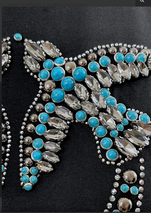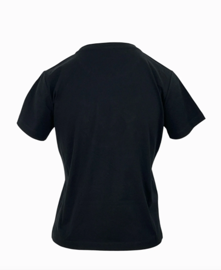 T-SHIRT CON PERLINE A RICAMO SUL COLLO E LOGO ICONICO FULL STRASS A CONTRASTO SULLA PARTE ANTERIORE