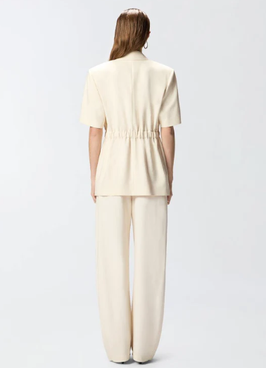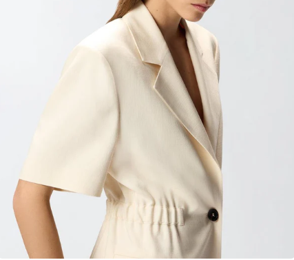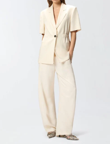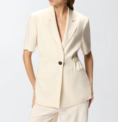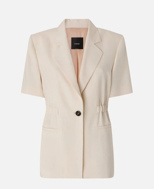 Giacca blazer da donna realizzata in tela di misto viscosa frisottina, un tessuto caratterizzato da un particolare filato ritorto che crea una superficie irregolare, quasi materica al tatto. Il capo si distingue per la sua eleganza effortless, data da dettagli di stampo più classico come il collo a revers, le tasche laterali a filetto e la chiusura monopetto a un bottone, e da elementi inediti, come il design a maniche corte e la comoda vita elasticizzata sul retro. Dai una svolta ai tuoi look da ufficio della bella stagione con questa rivisitazione estiva in pieno stile PINKO. - ASSAGO GIACCA