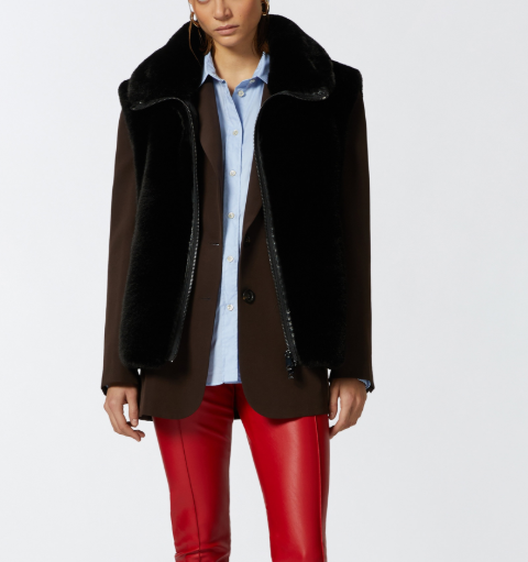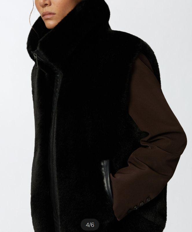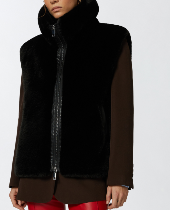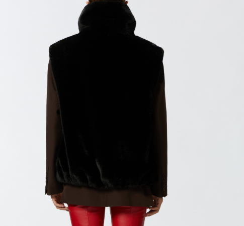 Giacca senza maniche realizzata in morbido tessuto di pelliccia sintetica, particolarmente soffice al tatto. La silhouette leggermente oversize e avvolgente di questo gilet è completata da un collo alto e tasche verticali a filetto sui fianchi. Chiusura frontale con zip in metallo a doppio cursore e orlo elasticizzato sul retro. Indossa il gilet da solo o sopra il tuo cappotto per aggiungere calore e giocare con il tuo stile.